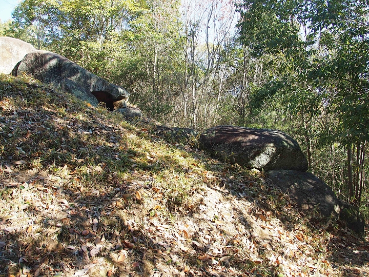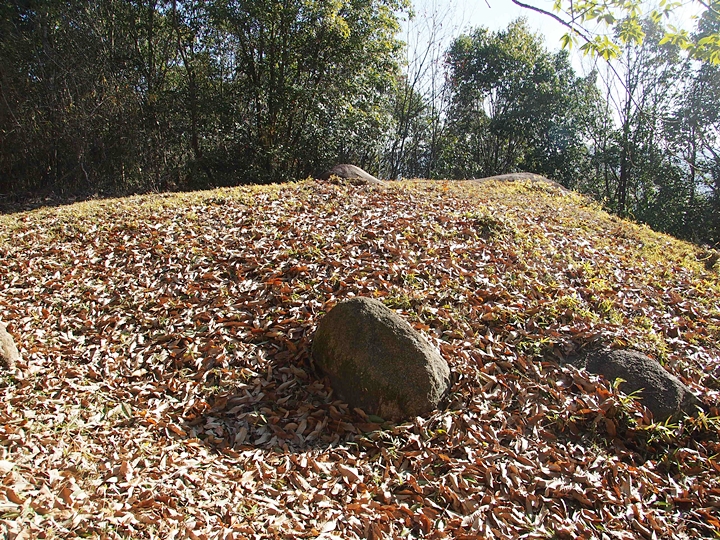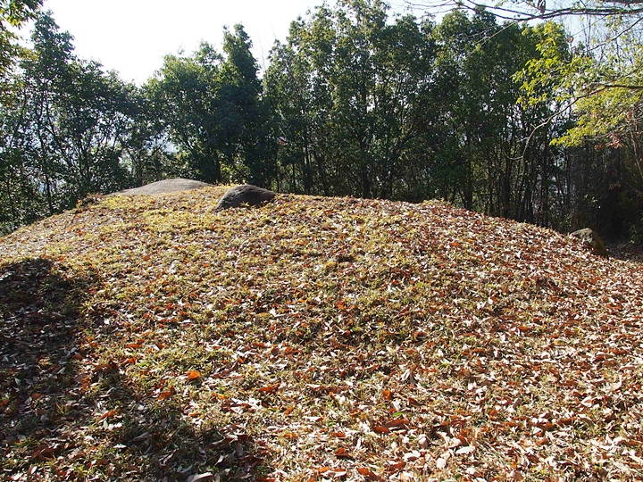 方形3段の墳丘の前面部にだけ更に2段の石段があって、計5段の方墳という全国でも珍しい形式で、定古墳との共通点があります。木棺と陶棺の他、なんと全面に金箔の貼られた双竜環頭太刀や金銅製品など、やはり貴重な出土品が見つかっています。