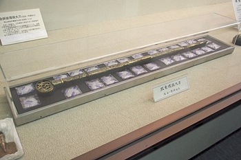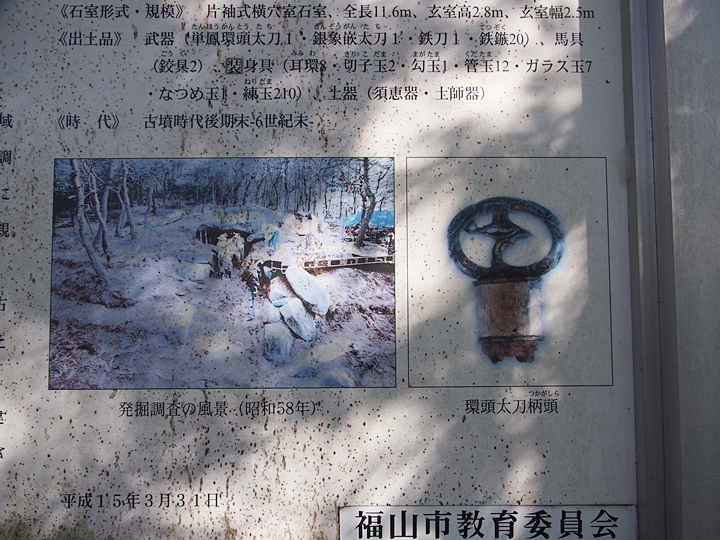 柄に8面体の金銅製筒金具、柄頭に楕円形(長径6.0cm、短径4.3cm)の金銅製環頭が装着され、環頭中央に鳳凰、周りに2頭の龍が施されています。県内では3例目の単鳳環頭大刀との事ですけど、説明板の写真は環頭太刀柄頭≠フみ。