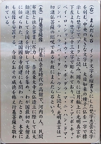 山門を潜りますと、まず眼に入りますのが、「行基菩薩像」と「まんだら石」です。行基菩薩像≠ニまんだら石≠フ間には説明板が設置され、こんな記載がありました(^-^)//"