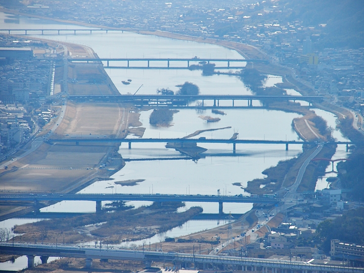 芦田川を眺望しますと、手前から河口に向かって、「山陽新幹線・山陽本線鉄橋」--「神島橋(国道2号線)」--「法音寺橋」--「草戸大橋」--「水呑大橋」--「小水呑橋」--「芦田川大橋」--「河口大橋(河口堰)」となりますネ。