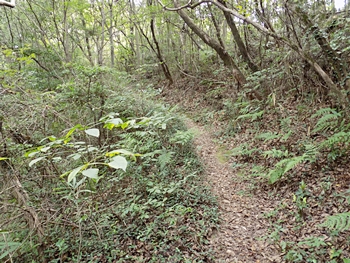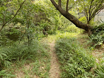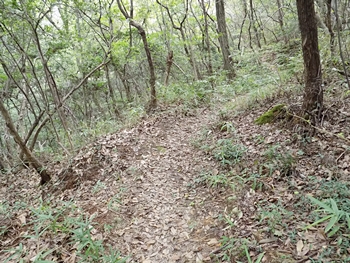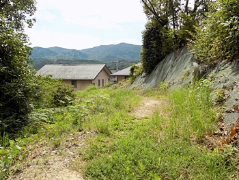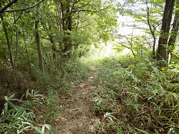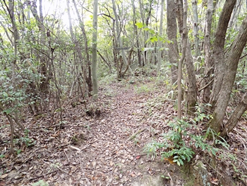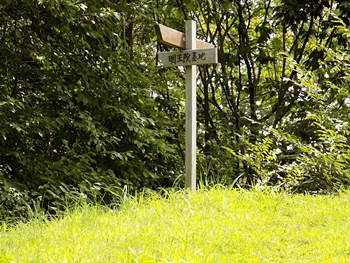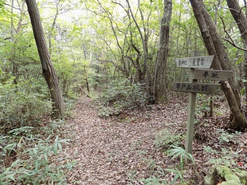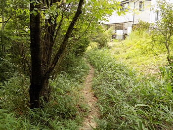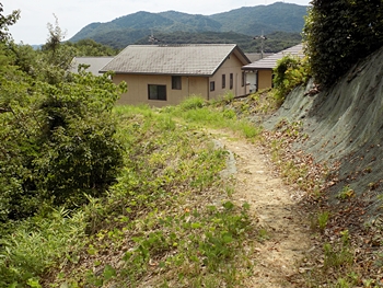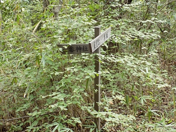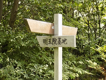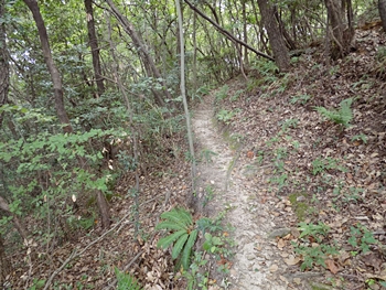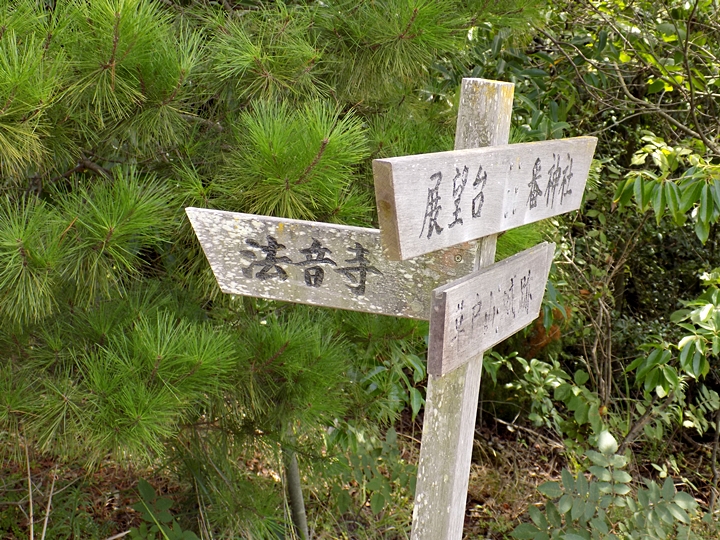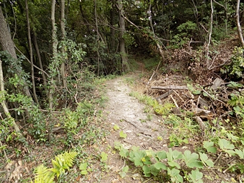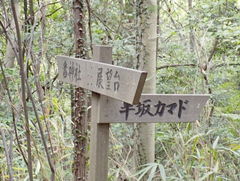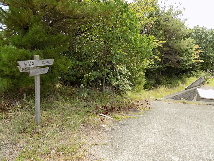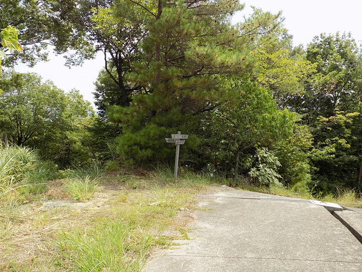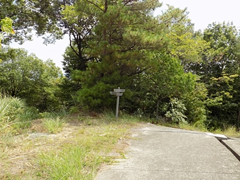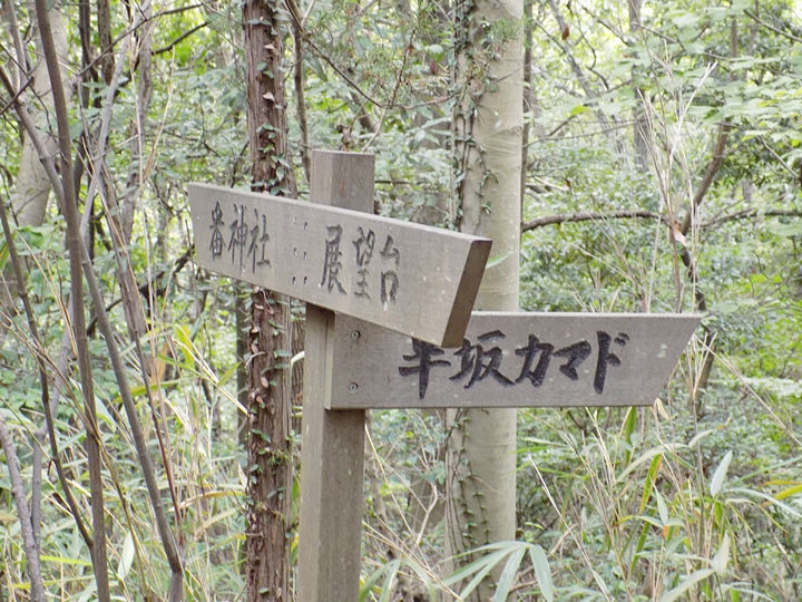 明王台団地横から、また山道にと入りますけど、ここには案内標識が…「←展望台 ↓法音寺 番神社・草戸山城跡→」ですから住宅脇から山の中へ…