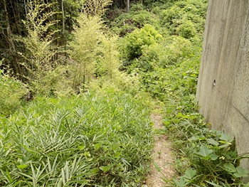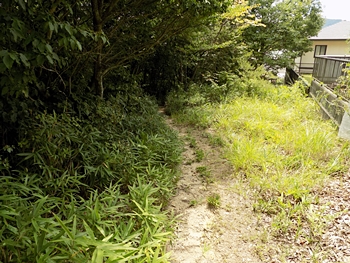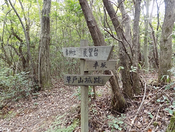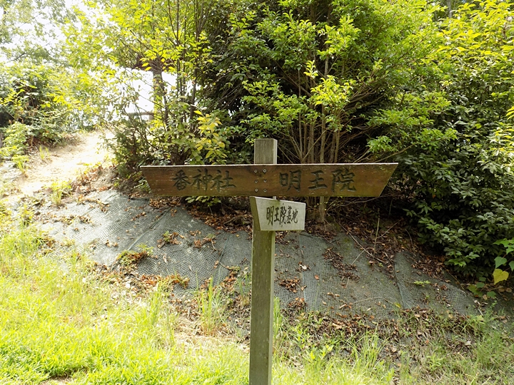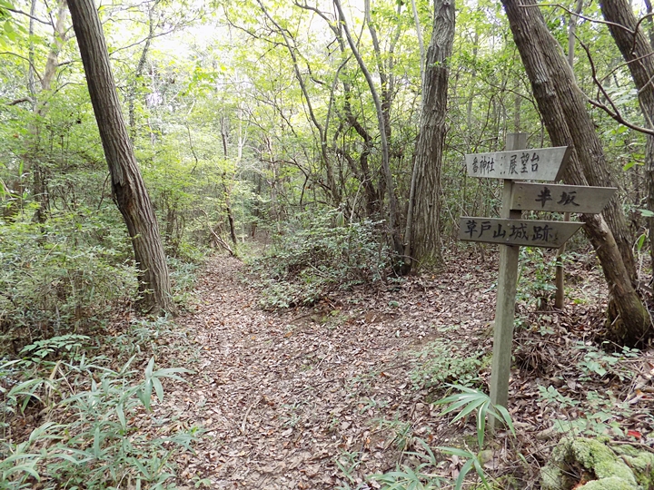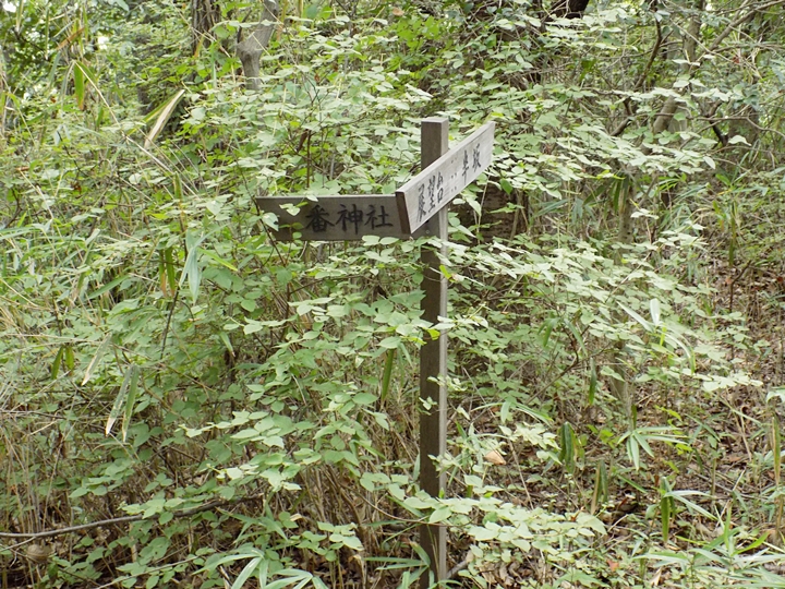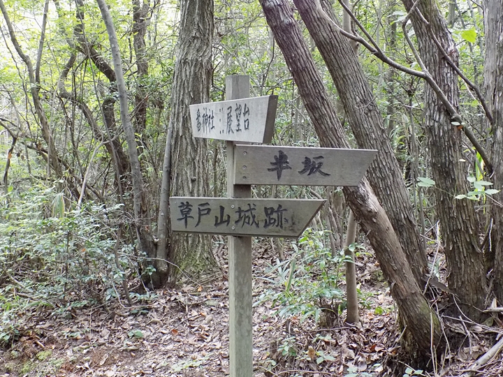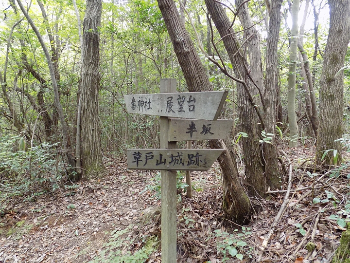 明王台団地横から山道に入り少し進みますと、スグに「←番神社 半坂? 草戸山城跡→」の案内板が。