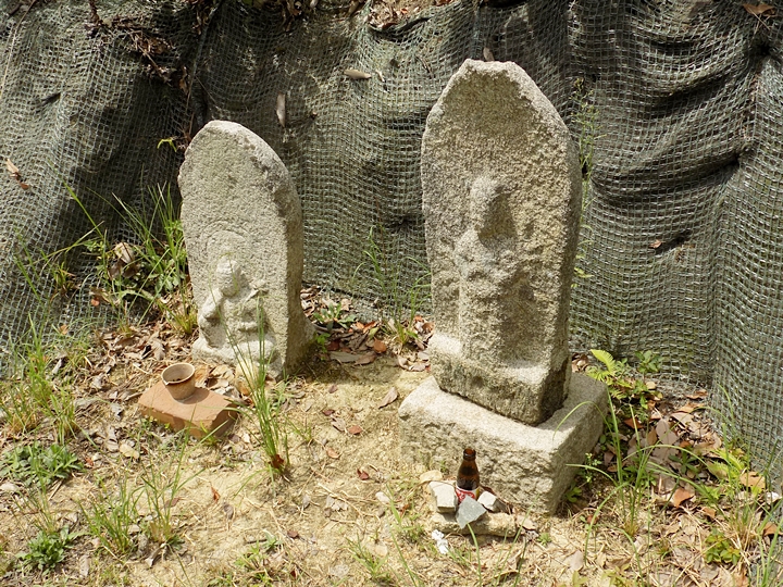 右側の二つの石仏を通り過ぎますと、明王台団地にと出て来ました。右に進みますと「草戸山公園(展望台)」ですけど、展望台は後で上がる事にしまして、草戸山城跡に急ぐ事に致します(^-^)//"