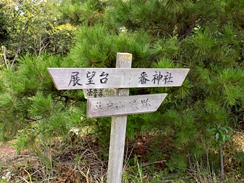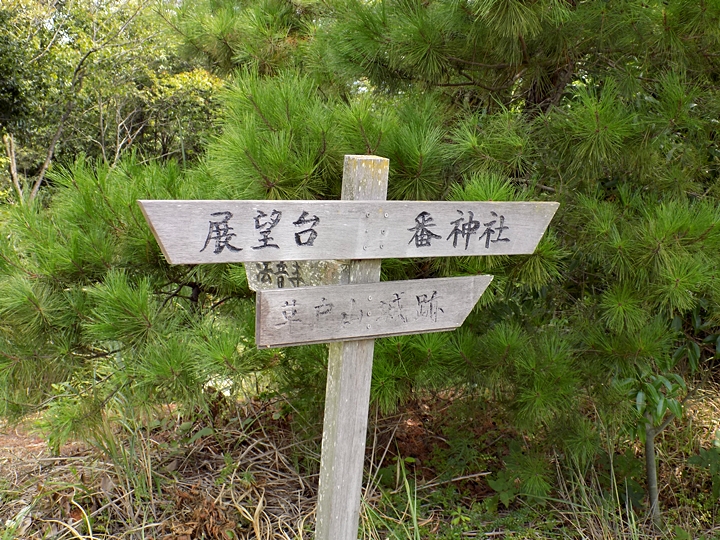 これを横目に進んで行きますと、程なく草戸山公園の駐車場に。この横を進みますと、案内標識が…草戸山城跡は「番神社」方向ですから直進です。