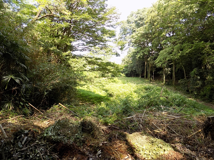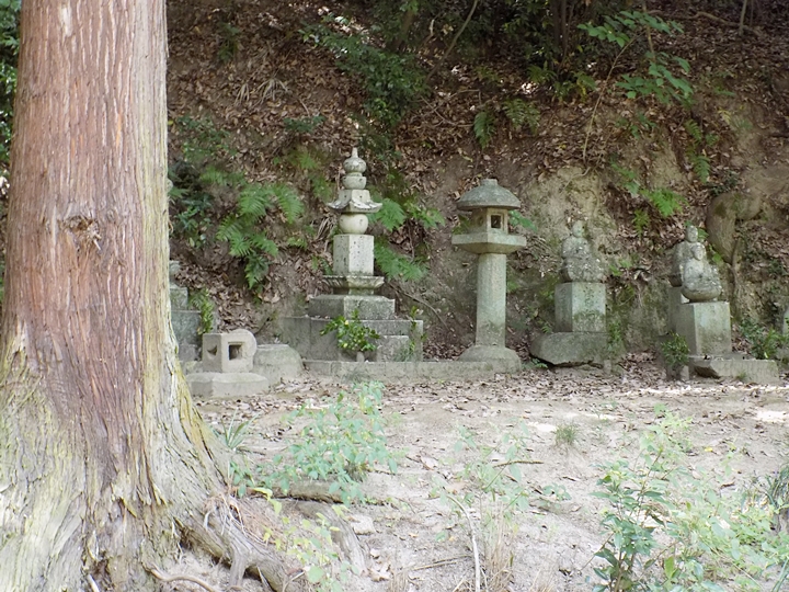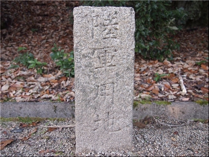 この場所が陸軍墓地である証を示すものは少ないが、「陸軍用地」と彫られた石(写真1)がそばの溝に放置されており、(写真2)がこの地から草戸山に登る途中で見つかった。