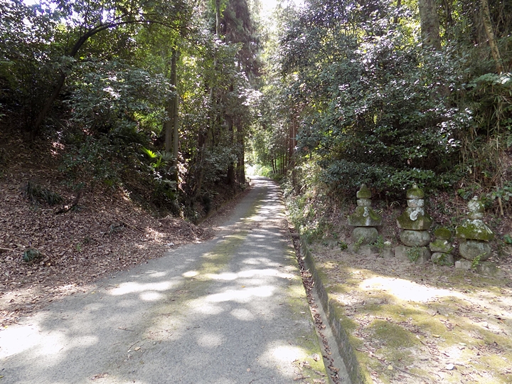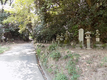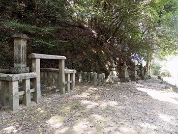 陸軍墓地に向かいます道へと降りて来ますと、この道の山裾には永い歴史を感じさせます墓石群が横一列に…