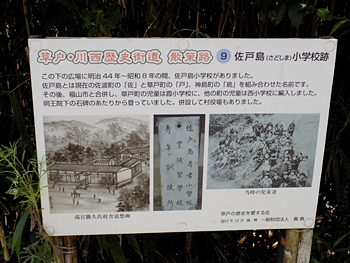 道を挟んで、これらの墓石群の前あたりに、「佐戸島(さどしま)小学校跡」の案内板が…