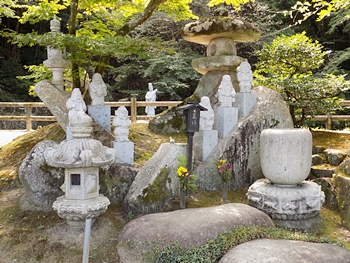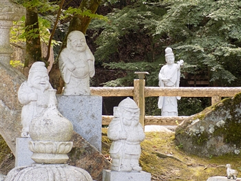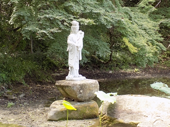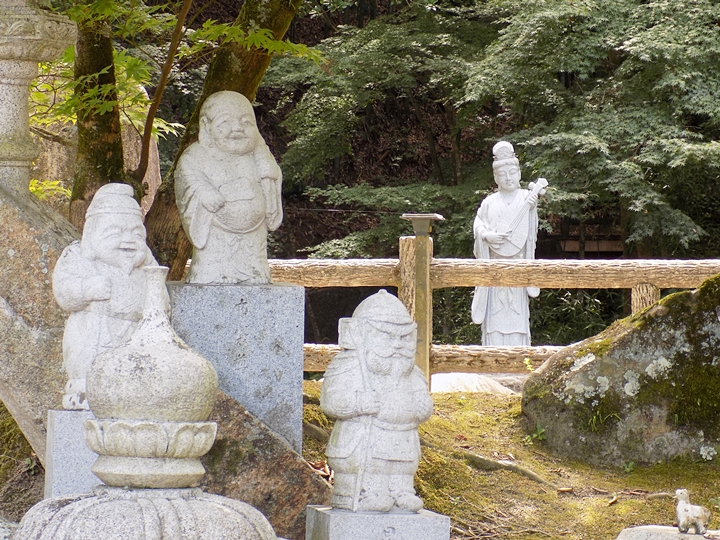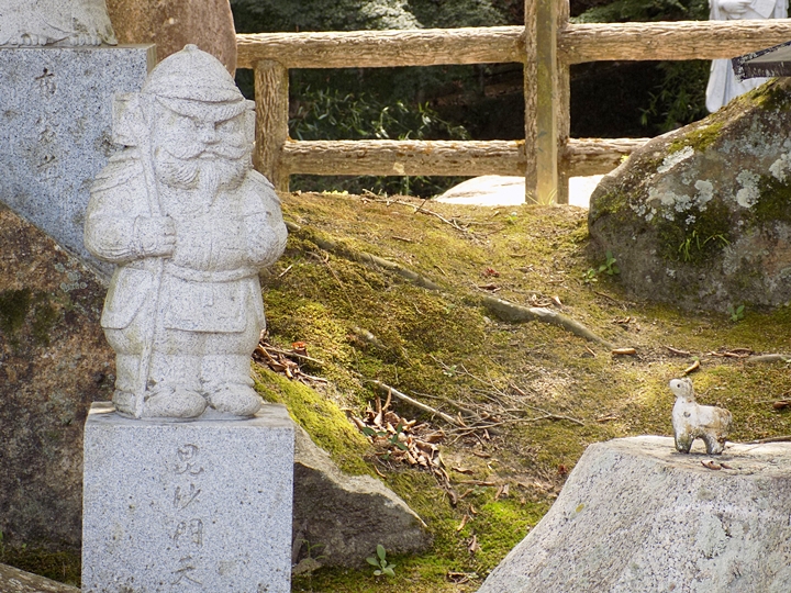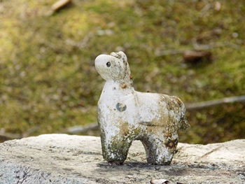 弁天池の手前には七福神像が並んでいますけど、毘沙門天を見つめますこの小動物は何なんでしょう?犬なのかも…