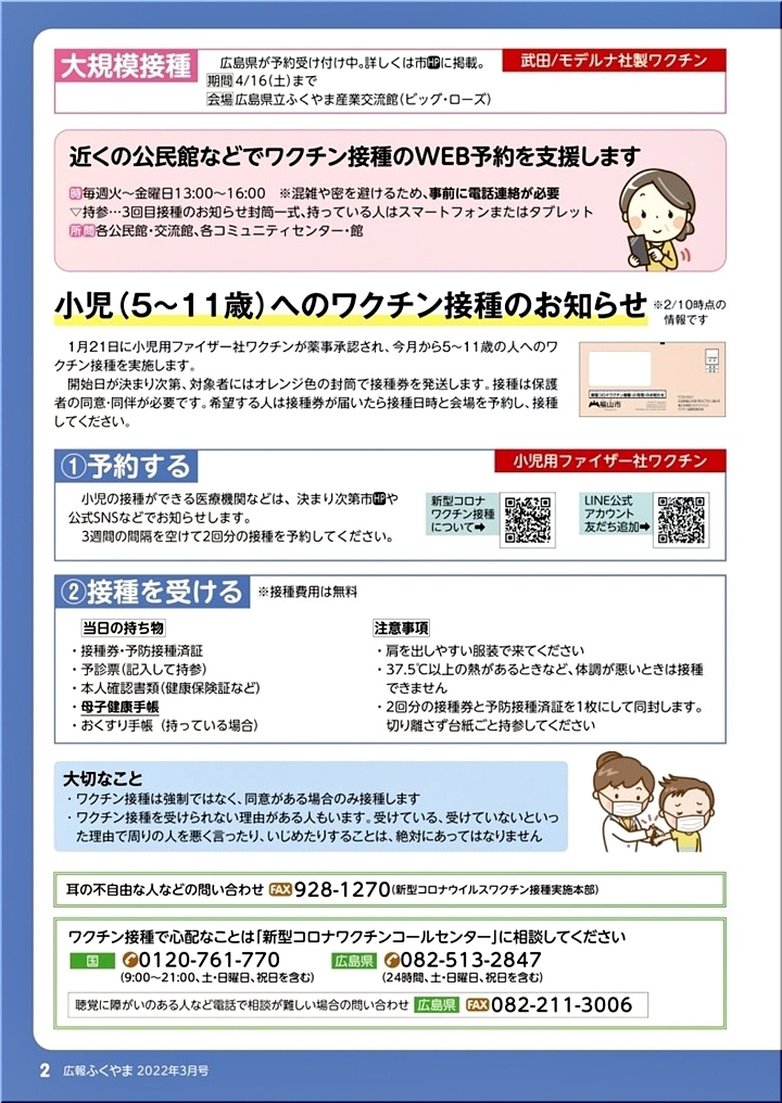 本日、新聞折り込みで配布の「広報ふくやま2022年3月号」でも、小児(5〜11歳)の皆様へのワクチン接種のお知らせが…