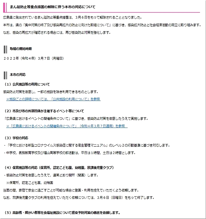 広島県に発出されているまん延防止等重点措置は、3月6日をもって解除されることとなりました。