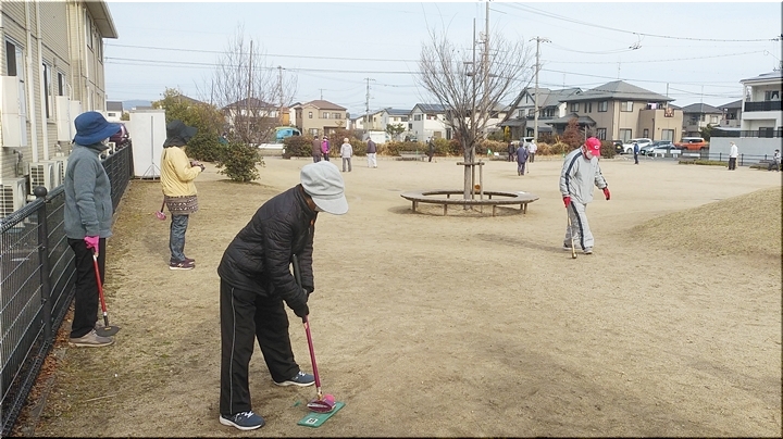 これは、本日・3/8(火)、グラウンドゴルフ再開2日目の一コマなんです。