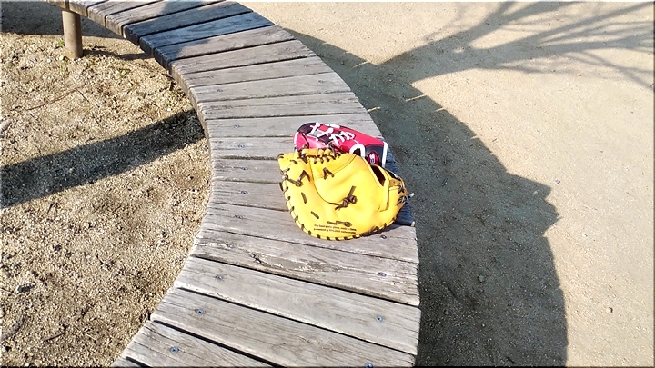 これは昨日も眼にしましたけど、ベンチにまだ新しそうなグラブが二つ…黄色と赤のグラブで大変眼に付きますのですけど、昨日と全く同じ位置に…