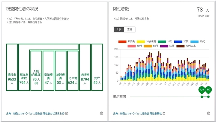 福山市の新たなコロナ感染者の発生は、3/7--68人・3/8--78人…と100名は下回っておりますけど、これは土・日曜日でしたからなのかも…