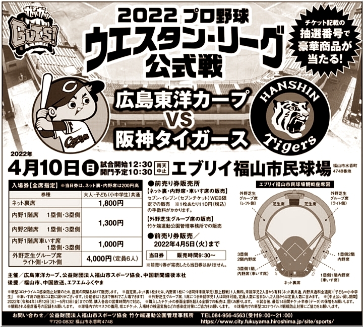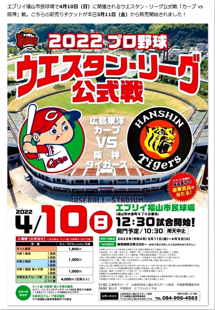 4/10(日)に、福山市民球場で「広島東洋カープvs阪神タイガース」戦開催とは嬉しいです(^_^)v