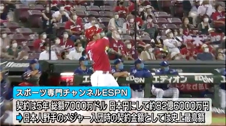 5年8,500万ドル(約100億3,000万円)は、1年目の日本人メジャー野手の中では08年にカブスと4年4,800万ドル(約56億6,000万円)で合意した福留孝介外野手を上回る史上最最大規模。日本人野手全体ではイチローの5年9,000万ドル(約106億2,000万円)に次いで2番目の大きさになる。
