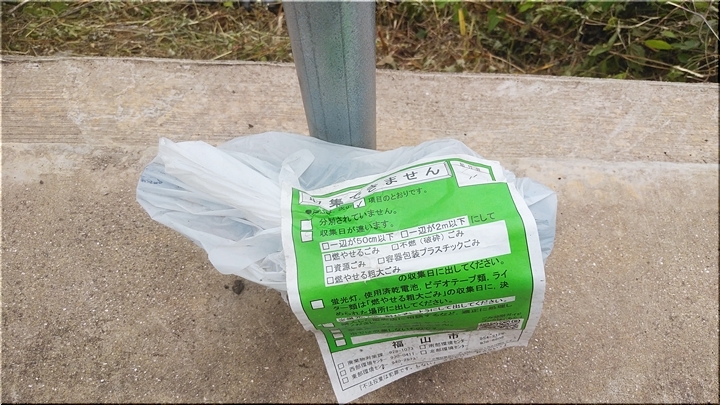 定刻少し前に水呑交番横の安政橋・浜自治会のゴミステーション脇に向かいますと、珍しく、収集不能物は1袋と少ない状況でありました(^.-)☆
