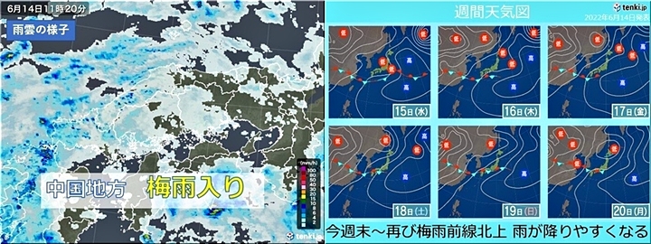 中国地方はきょう14日に、平年より8日遅く、昨年より1か月以上(33日)も遅い梅雨入りとなりました(速報値)。