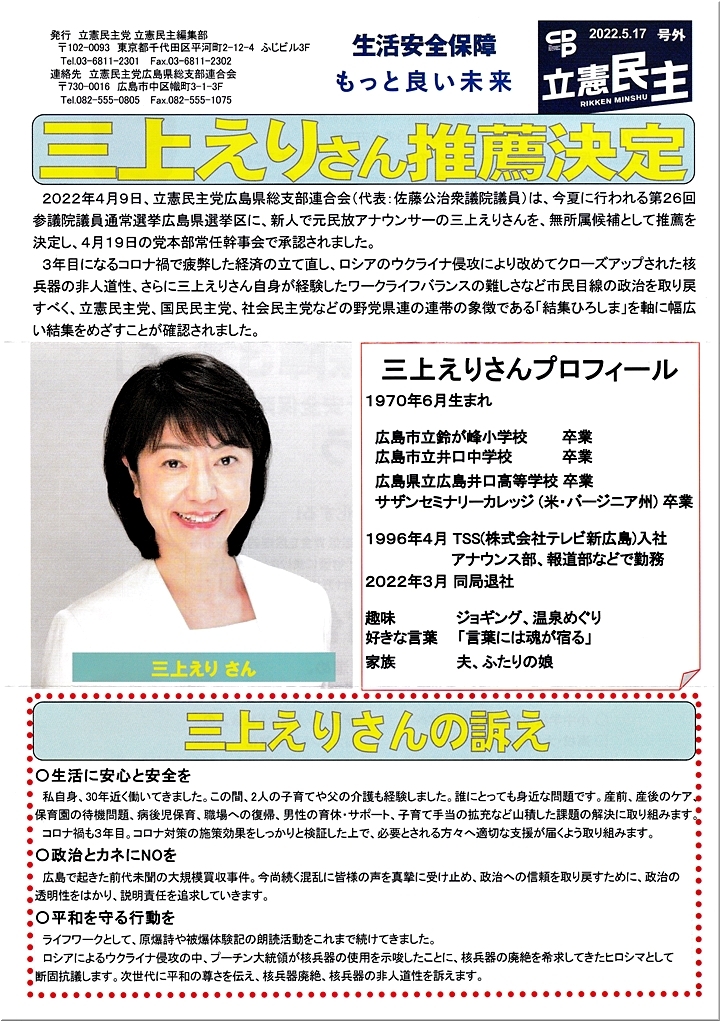 ◆参院選 立憲・国民が統一候補に元アナウンサー 広島