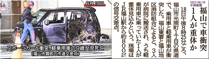 6月18日夜、福山市の交差点で軽乗用車とスポーツカーが衝突する事故があり、軽乗用車に乗っていた9歳の小学生の女の子が死亡したほか、運転していた祖父など2人が重軽傷を負った。18日午後8時25分ごろ、福山市霞町の市道の交差点で右折していた軽乗用車と、対向車線を直進してきたスポーツカーが衝突した。