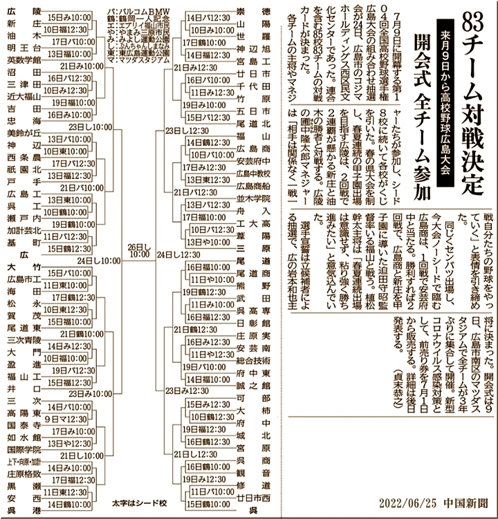 今朝の中国新聞sanの朝刊に、7/9(土)から開幕の全国高校野球選手権広島大会の日程・組合せが掲載されておりました。