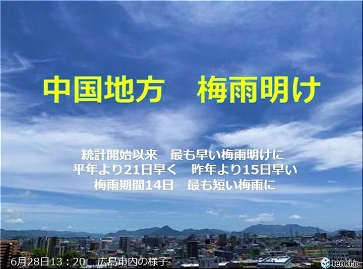 ◆中国地方 過去最も早い6月の梅雨明け 梅雨期間わずか2週間の空梅雨に 猛暑に警戒