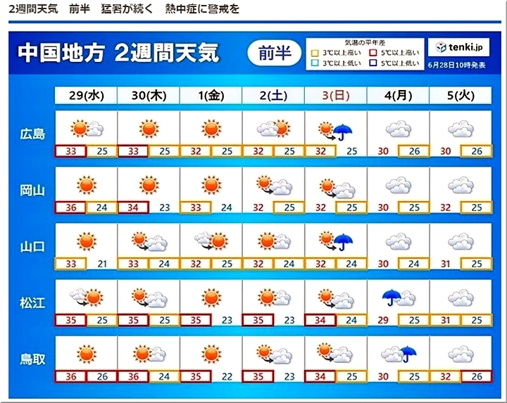 中国地方は統計開始以来最も早い梅雨明けとなり、6月14日の梅雨入りからわずか2週間という短い梅雨となりました。また、降水量は平年に比べて少ない空梅雨となりました。今週は強い日差しと厳しい暑さが続くため、熱中症に警戒が必要です。