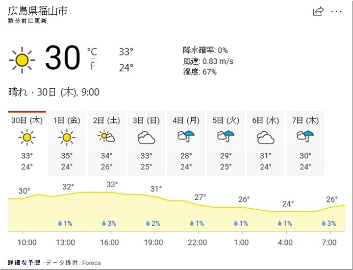 福山市の週間天気予報を見てみますと、う〜ん、降水はほとんど無し。7/4(月)〜7/7(木)間に傘マークが有りはしますが、降水確率は、1〜3%。
