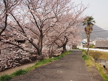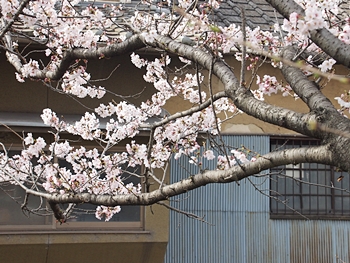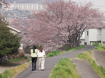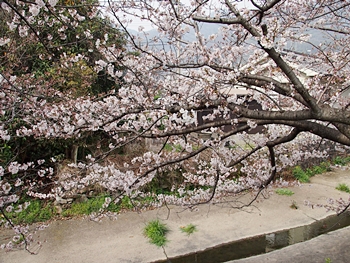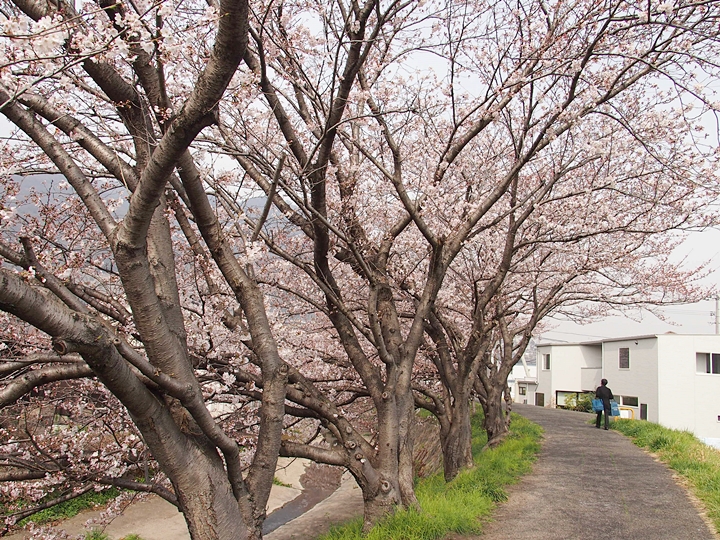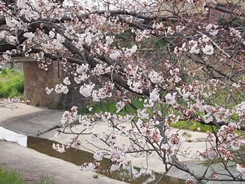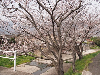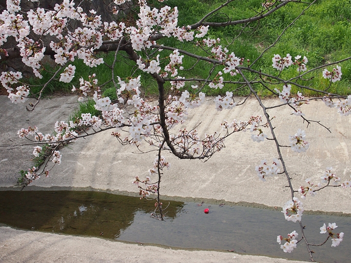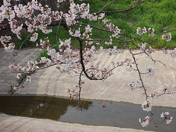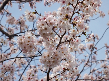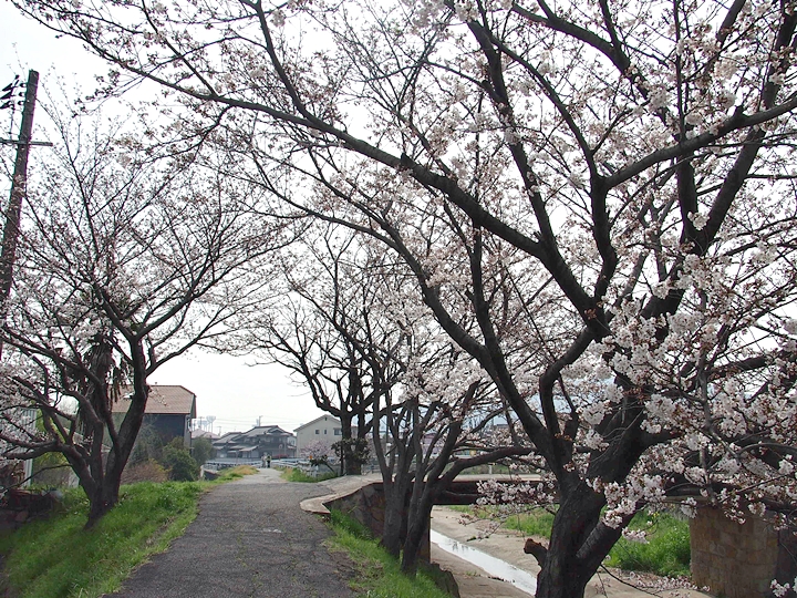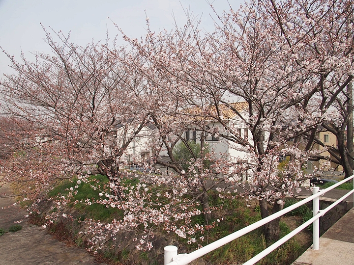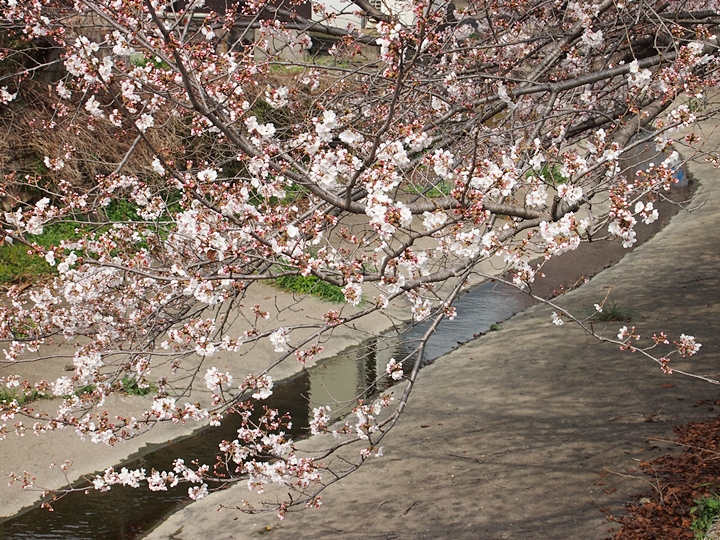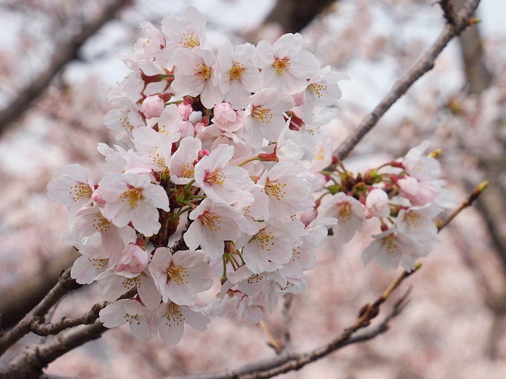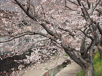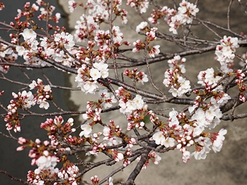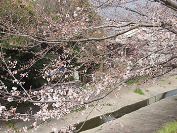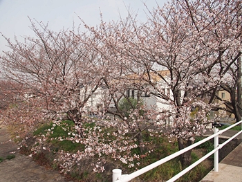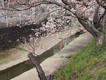 豊年橋まで戻り北側のサクラの全体を眺めますと、ふ〜ん、下半分は、ほぼ満開に近いのですけど、上半分は、まだまだ蕾が目立ちます。水呑川土手のサクラ並木の満開には、もぅ4〜5要しそう。