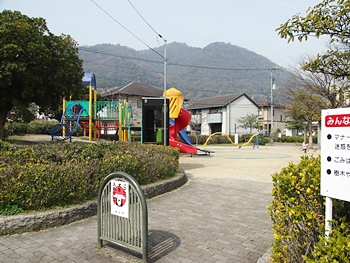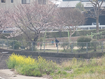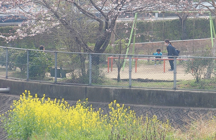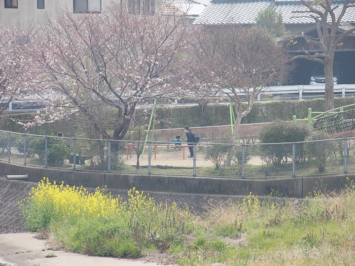 鉄橋跡の橋上から鍛冶屋公園に眼を向けますと、お子さんとお母さんがブランコで楽しそうに…それを傍らのベンチで見守りますお祖母san。