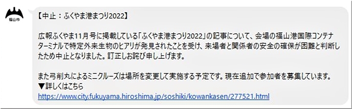 福山市からのLINEでは、「ふくやま港まつり2022」は、ヒアリ出現で中止のようですネ。いつでしたか、福山港国際コンテナターミナルでヒアリが発見された旨、中国新聞への記事掲載がありましたけど、ふん、ふん、安全確保が難しい為、中止なんですねぇ〜