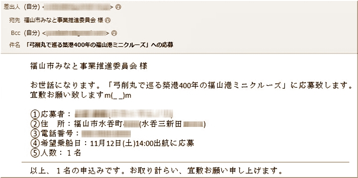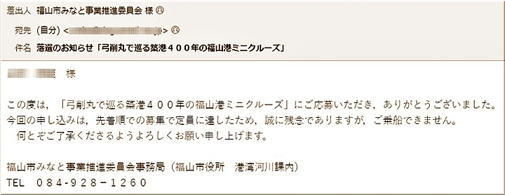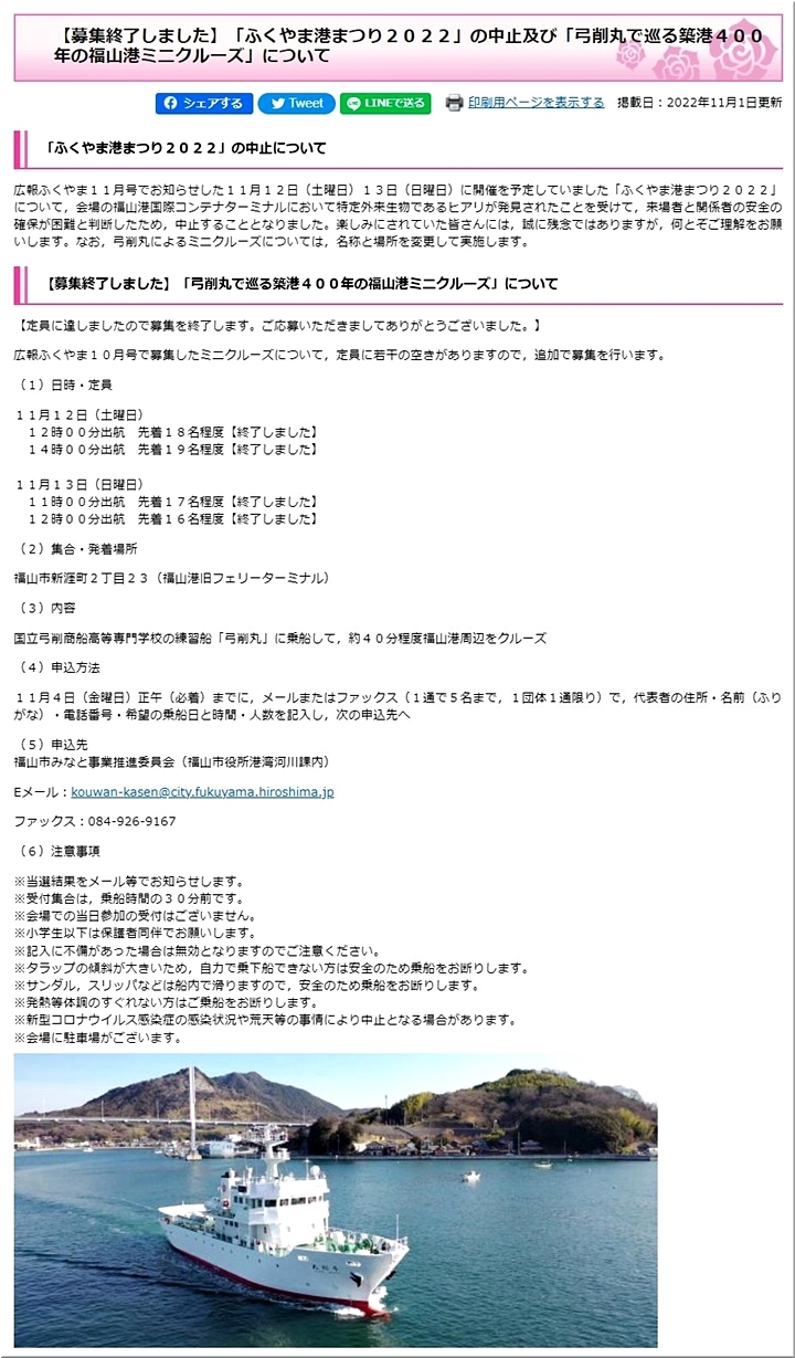 これも抽選ですけど、とりあえずメールで応募です。11/12(土)14:00出航を希望して応募しましたけど、福山市のイベント参加者募集には落選が続いていますGONsan。これも、あまり当てにせず待ちますけど、当選しますとラッキーかも(^-^)//"