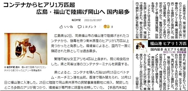 以前から、福山市内の一部地区では、一般住宅の庭先等でもヒアリ生息が確認されていますから、今回の件も今後の動向が大変気になります。