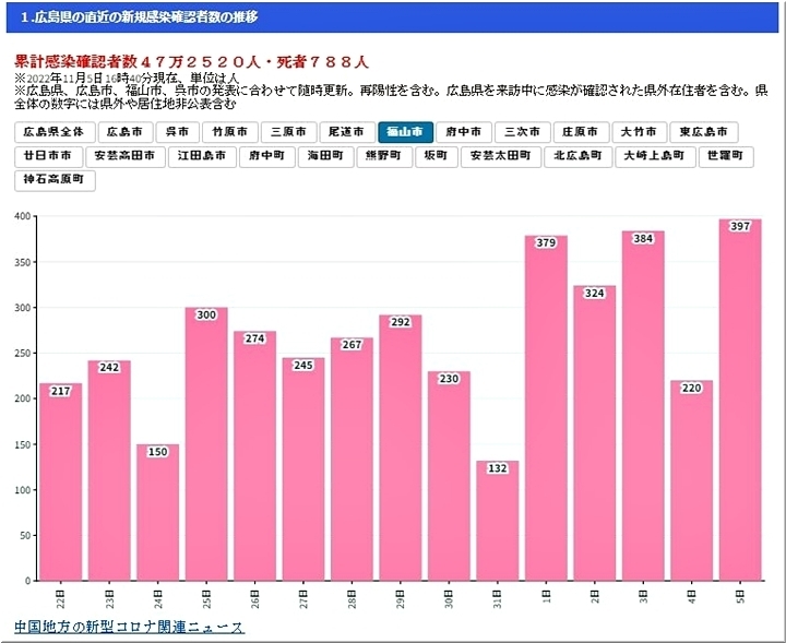 昨日の福山市の発表では、新たなコロナ感染者発生は久々に400人越えですネ(^-^;