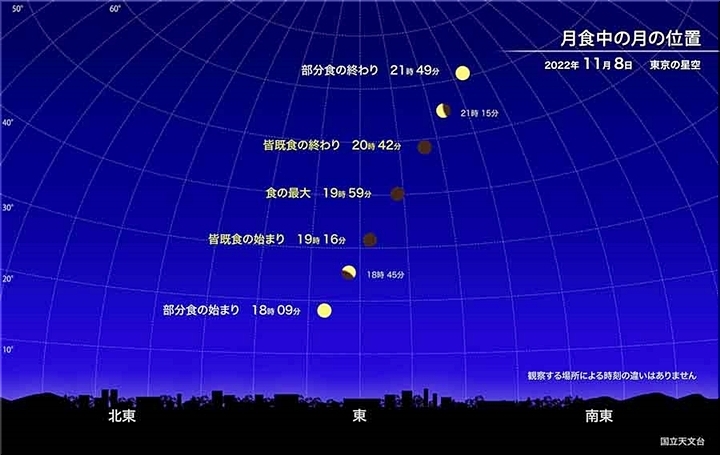 西ほど月が昇るのが遅く、西日本では部分食の開始時は月の高度はまだ低め。部分食のはじめから観測する場合は、空の開けた場所からお楽しみください。