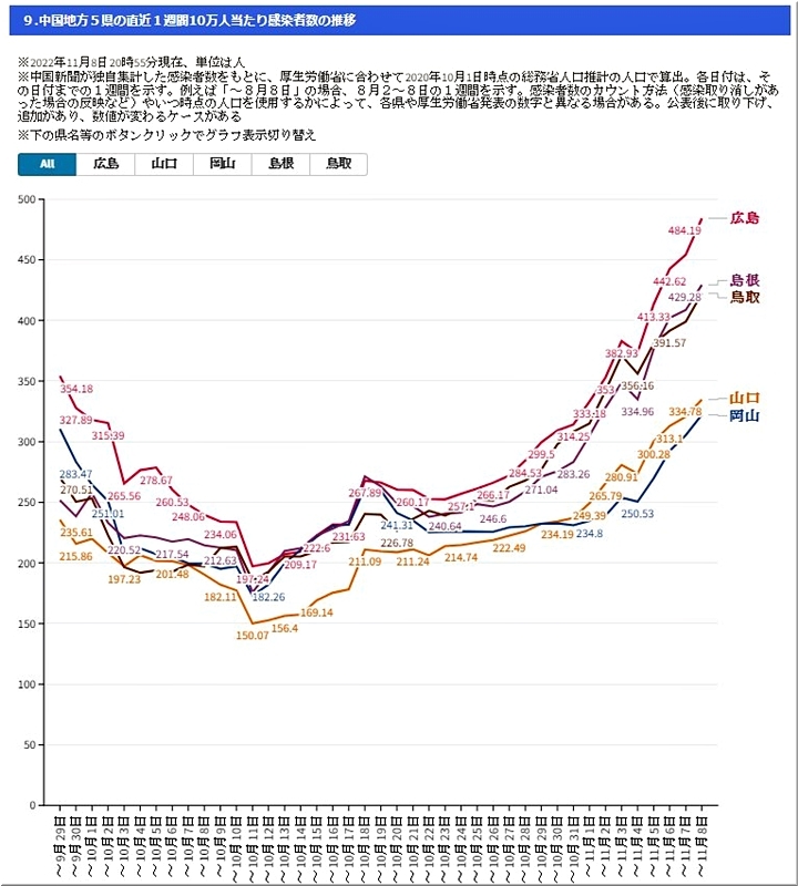 ◆広島県2,915人感染1人死亡、1週間前から839人増 8日新型コロナ