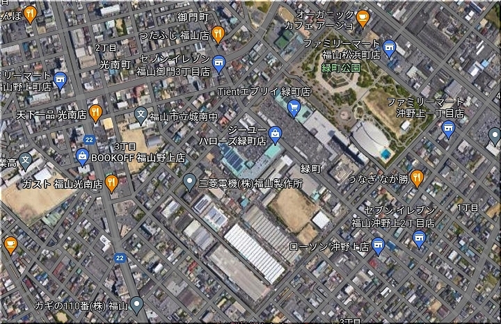 三菱電機福山工場の中にあった野球場。1リーグ時代の1948年に広島県初のプロ野球公式戦、南海?急映が「日本野球中国シリーズ」として行われた。企業の敷地内にある球場でプロ野球が行われたのは、三菱電機の他に富洲原(三重県)と高岡鐘紡(富山県)の3か所だけと希少だ。