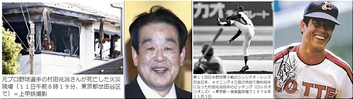 11日午前3時15分頃、東京都世田谷区成城、プロ野球・ロッテ元投手の村田兆治さん(72)方から出火、木造2階建て住宅の2階部分約40平方メートルが焼け、室内から村田さんが救助されたが、搬送先の病院で間もなく死亡が確認された。警視庁成城署が出火原因を調べている。