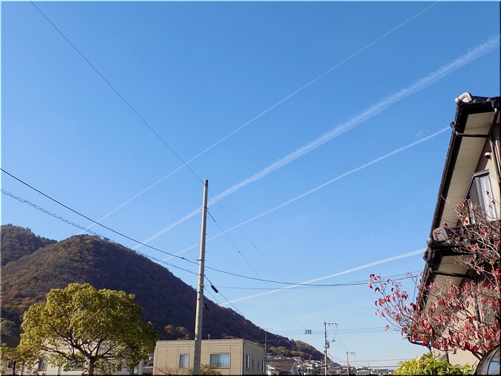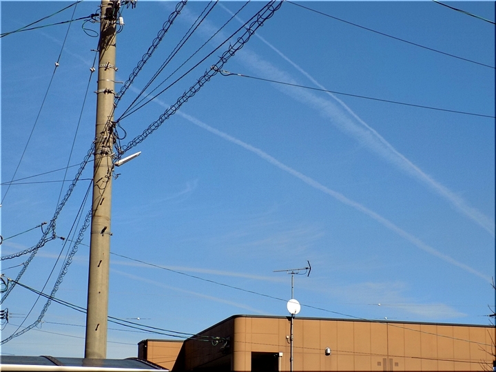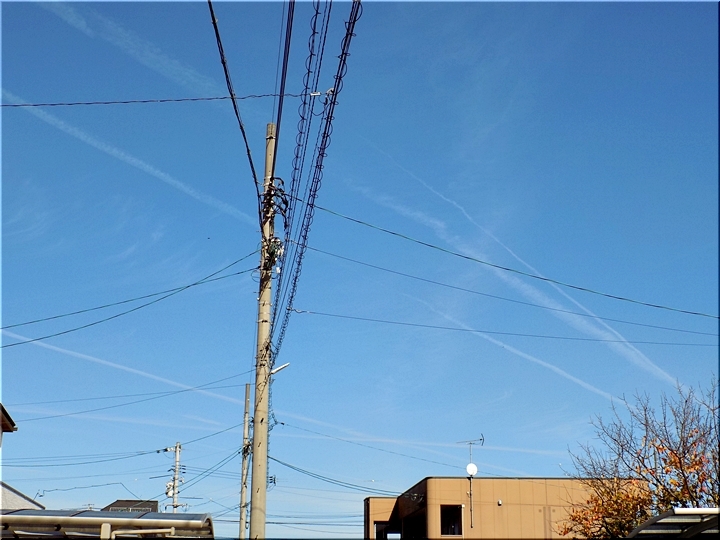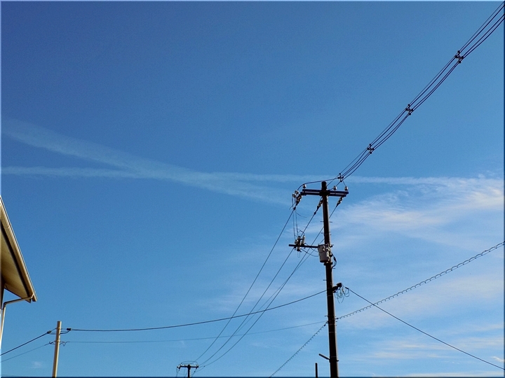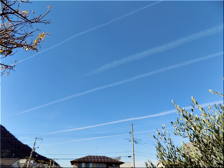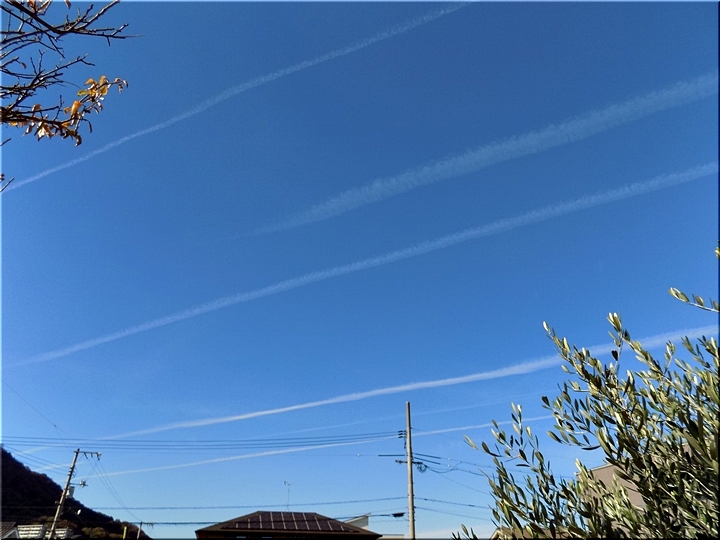 昼食後、一服のため外に出まして真っ青の空を見上げますと、9本の飛行機雲が…相変わらず、我が家上空は飛行機の通り道のようですねぇ〜
