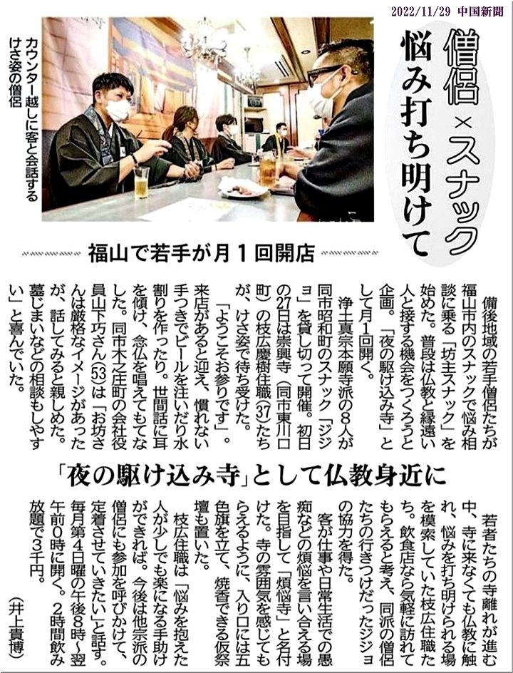 記事によりますと、「若者達の寺離れが進む中、寺に来なくても仏教に触れ、悩みを打ち明けられる場を模索。そんな中、『坊主スナック』を企画し、ジジョsanの協力を頂き実施…」と言う事なんですネ(^-^)