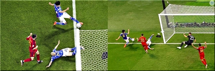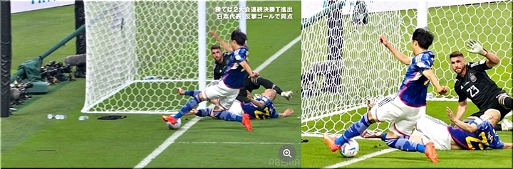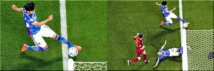 サッカーのカタール・ワールドカップ(W杯)は1日(日本時間2日)、グループリーグE組で日本がスペインに2-1で逆転勝ち。勝ち点6のグループ首位で決勝トーナメント(T)進出を決めた。後半6分に田中碧が2点目を入れた場面ついて、直前にゴールラインを越えていたのではないかと海外で論争に発展。しかし、上から見たら正当性が分かる証拠画像も多く公開され、海外ファンから「髪の毛1本レベル入ってる」「重要なのは接地じゃない」との声が上がっている。