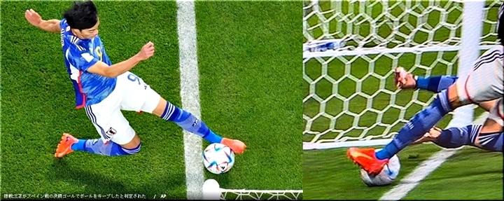 森保一監督率いる日本代表は、現地時間12月1日のカタール・ワールドカップ(W杯)グループリーグ第3節でスペイン代表と対戦し、2-1の逆転勝利を収めた。ビデオ・アシスタント・レフェリー(VAR)判定によって認められた日本の決勝ゴールを巡り、ブラジルメディアは真上からどアップで捉えた画像を紹介し、「1ミリ」エリア内に入っていると報じ、「明らかに出てない!」「99%アウトは100%イン」と反響を呼んでいる。