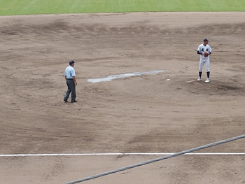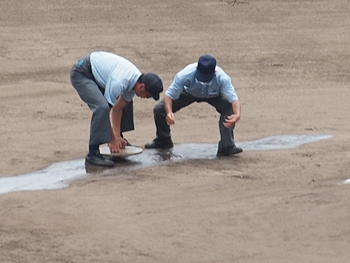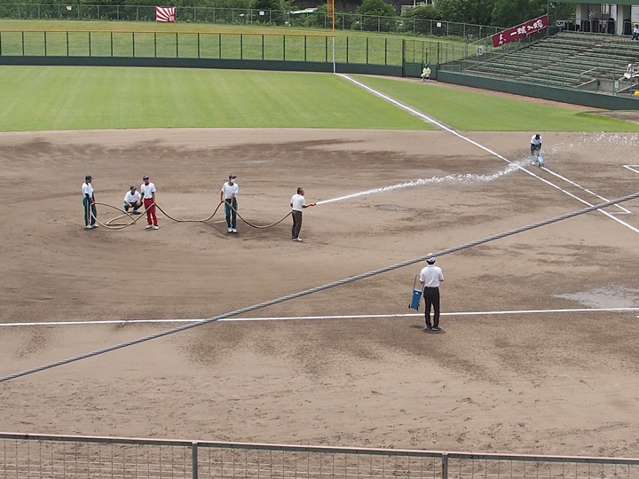 ピッチャーマウンドの後方に散水栓がありますけど、グラウンド整備後、このバルブの閉め方が甘かったのかも…突然、漏水が始まりましたから、当然の事ながら試合中断です(^-^)