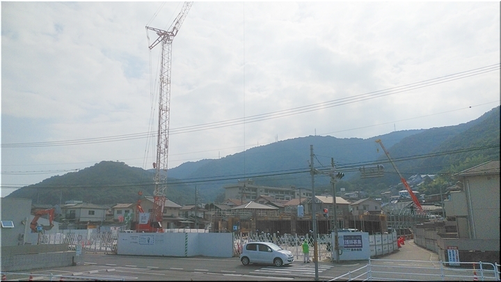つぃさっき…と言いましても1時間ばかり前ですけど、藤井病院建設現場に眼を向けますと、クレーンが、こんな状態で作業終了でありました。