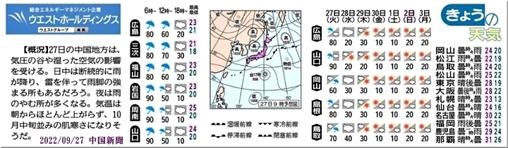 27日の中国地方は。気圧の谷や湿った空気の影響を受ける。日中は断続的に雨が降り、雷を伴って雨脚の強まる所もあるだろう。夜は、雨のやむ所が多くなる。気温は朝からほとんど上がらず、10月中旬並みの肌寒さになりそうだ。