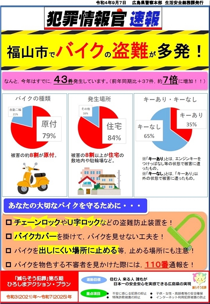 ◆バイク盗難急増、昨年比7倍 広島県福山市内、自宅の敷地で被害8割、施錠していても被害6割
