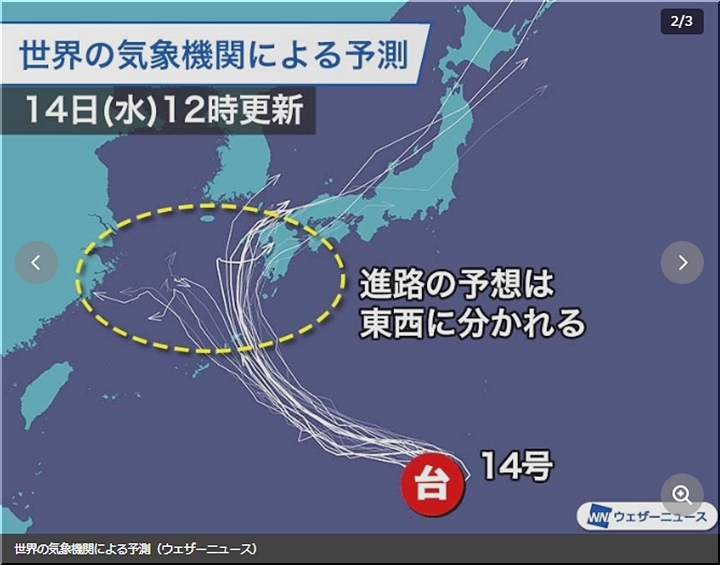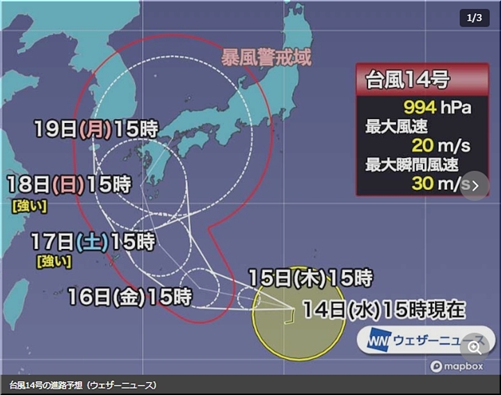 大変気になります台風14号の動向ですけど、頻繁にウエザーニュースに眼が向いてしまいます。
