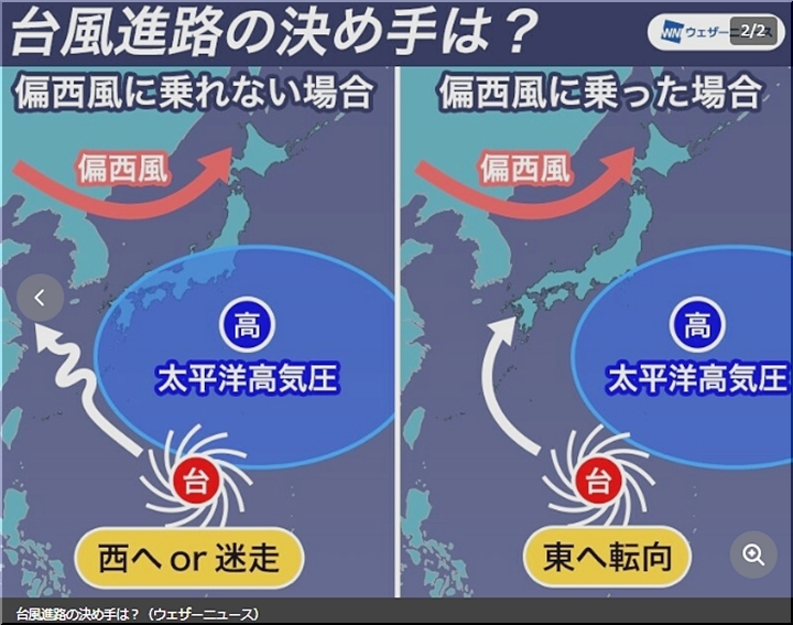 台風14号の進路に大きく影響するのは、太平洋高気圧の勢力です。台風は高気圧の縁に沿うように進むため、高気圧が西に大きく勢力を広げると北上できずに西進。勢力が東に後退するほど早く北へ進路を変え、その後は上空の偏西風に乗って北東に進みます。