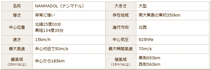 中心気圧は925ヘクトパスカル、中心付近の最大風速は50メートル、最大瞬間風速は70メートルとなっています。