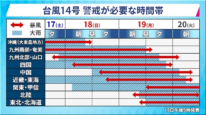 この台風は、今後日本の南を北西へ進み、非常に強い勢力を維持したまま、17日(土)の日中に大東島地方に接近し、その後、17日夜から19日(月)にかけて、奄美地方から九州にかなり接近するおそれがあります。