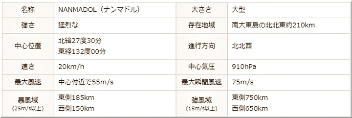 中心気圧は910ヘクトパスカル、中心付近の最大風速は55メートル、最大瞬間風速は75メートルとなっています。